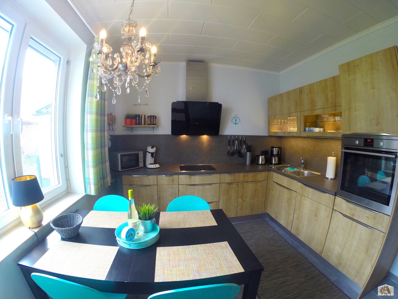 Der vorwiegend maritime Stil wurde auch in der Ferienwohnung "Meeresrauschen" wieder aufgegriffen. Hier ist er mit klassischen Elementen (z.B. dem edlen Kronleuchter) von schlichter Eleganz kombiniert worden.