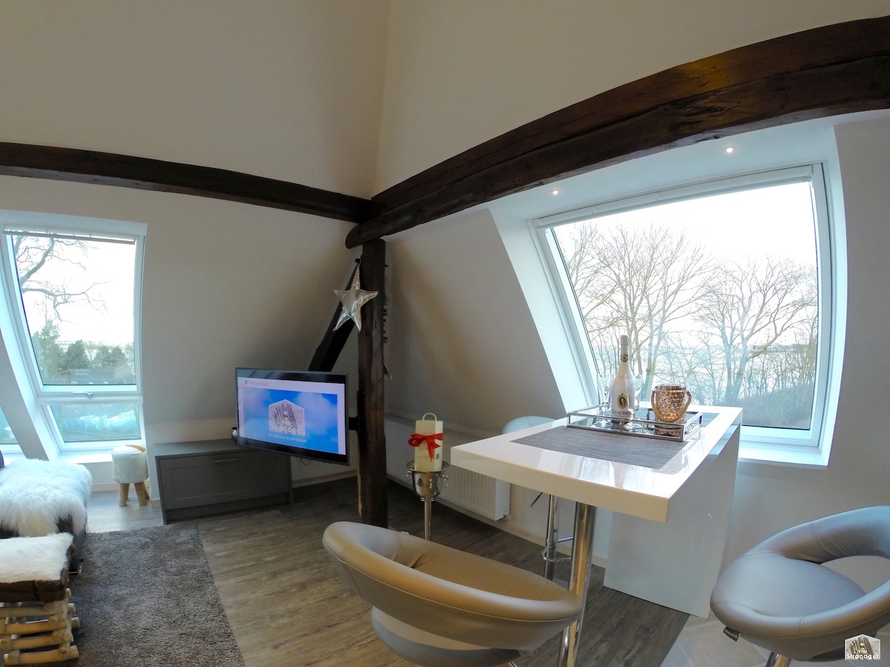 Die Ferienwohnung "Strandgut" im Dachgeschoss der Villa zeichnet sich durch die Kombination aus historischer Moderne - die offene, alte Balkenlage des Daches wurde bewusst ins Einrichtungskonzept integriert - und Exklusivität aus. Feine Materialien (z.B. ein Echtglas-Schalterprogramm) wechseln sich hier mit frischen Akzenten ab.