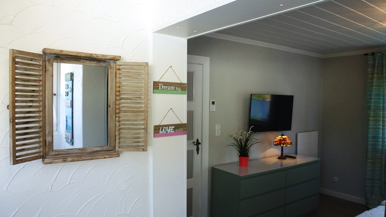 In der Ferienwohnung "Treibholz" ist der Name Programm: Hier wurden viele Möbelstücke und Accessoires aus Echtholz und in Treibholz-Optik verwendet.